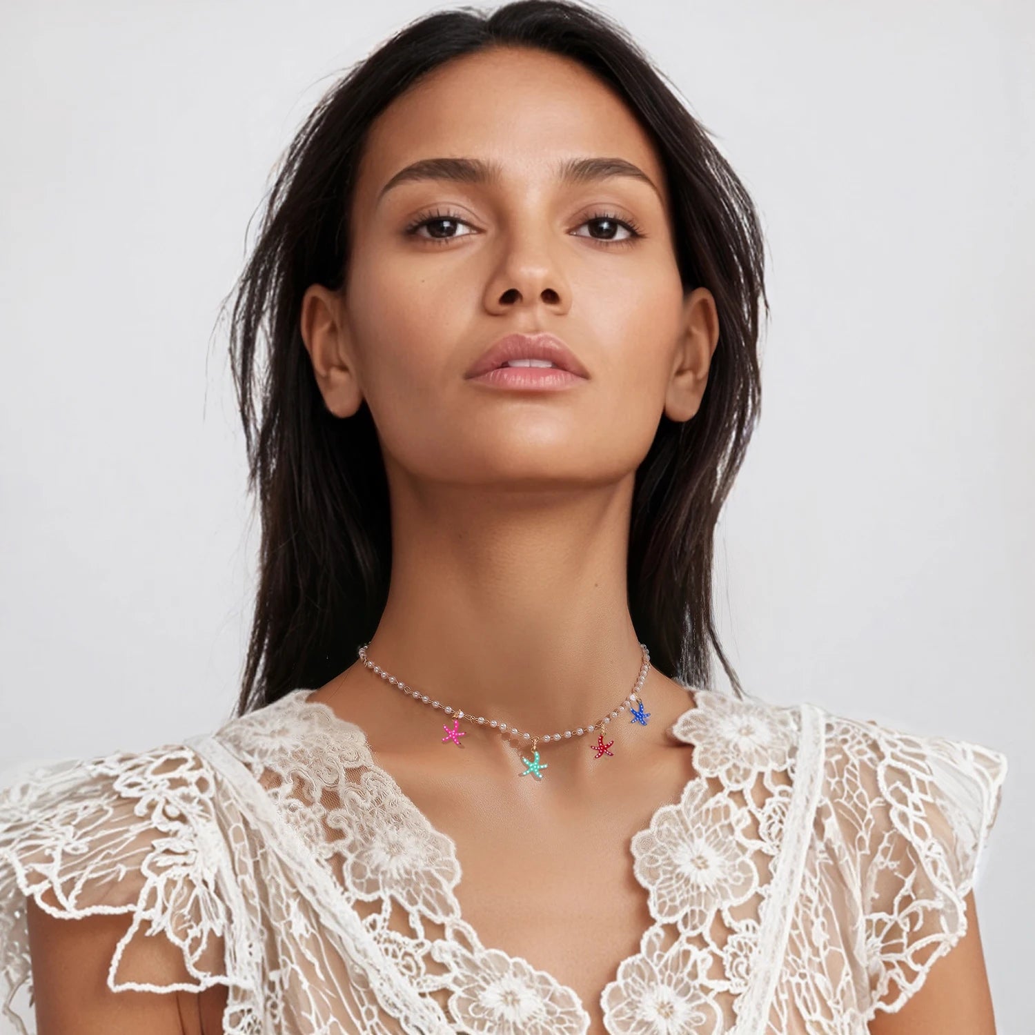 Ein Stück Küste zum Tragen – die „Pearl Starfish Necklace“ vereint den klassischen Look einer Perlenkette mit einem farbenfrohen Seestern-Anhänger. Inspiriert vom Ozean, strahlt sie Leichtigkeit, Boho-Chic und sommerliche Lebensfreude aus.