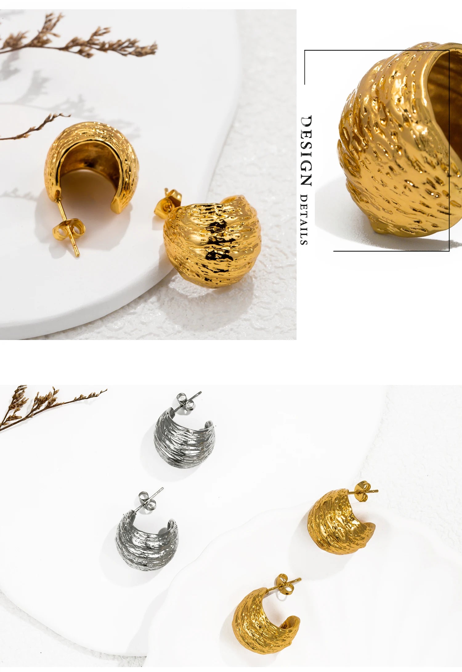 Gefertigt aus hochwertigem Edelstahl und veredelt mit einer 18K Echtvergoldung, sind sie hypoallergen, wasserfest und farbbeständig – perfekt für jeden Anlass, von Alltagslooks bis zu besonderen Abenden.